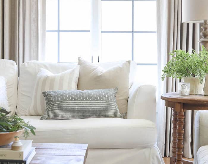 Today I’m sharing our living room decorated for Christmas. This year I chose to only bring out my absolute favorite pieces, that also complimented the neutral decor we have in our living room. Little bits of my favorite winter greens tucked in and around our living room make things feel extra festive without requiring a ton of work. I brought out my favorite white ornaments, a few table top trees, a few bottle brush trees, which all set the perfect back drop for our Christmas tree to take centerstage.