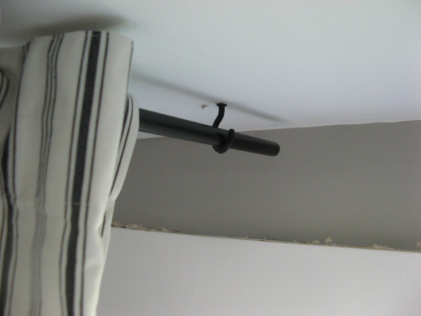 Second: Behind closed curtains. Our laundry room doubles as our playroom because of the size of the room that it is. So to separate the two spaces, and hide the washer & dryer from the kids and any guests we had over I decided to hang curtains in front of them to act as make-shift doors. So I headed down to my local “          -mart” store and picked up some black screw in hooks, to match the black curtain rod I already had. Then I measured (so my husband wouldn’t pass out from uneven lengths and crookedness) and screwed in the hooks evenly apart from one another like so :