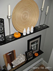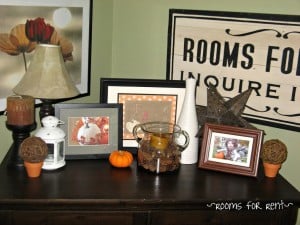 Out of the smaller frame, I used an extra piece of matting, and ended up cutting out a picture of a pumpkin from a magazine that I really liked. I mean heck if I can’t duplicate the photo, I might as well frame it because it’s still pretty. HA ๐ In the larger frame I used some orange scrapbook paper, and the punch-out letters to spell fall, and also drew and cut-out a tiny pumpkin, and then kinda scrapped it together. Then I grabbed some leftover terra cotta pots I had from a summer project, and whatever else I had on hand that was fall like. i.e. candles, pine cone vase fillers, twine balls, and re-arranged some of my knick knacks to get this: