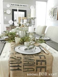 You are here: Home / Thanksgiving Tablescape Tour {Coming Soon} / burlap runner mercury glass