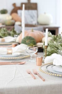 You are here: Home / Thanksgiving Tablescape {with bay leaf garland} / Fall Farmhouse Tablescape | Rooms FOR Rent Blog