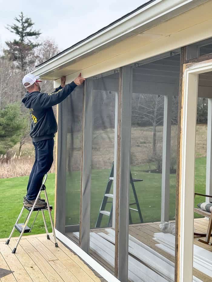 He got to work so fast that he had installed all the new screens before I was even able to snap a picture, lol. He rolled the screens out and cut one section per panel for the section between each of the porch posts. That way, if something ever happens, and the screen needs to be repaired, he only has to repair one section, instead of the entire porch. His idea, not mine 😛