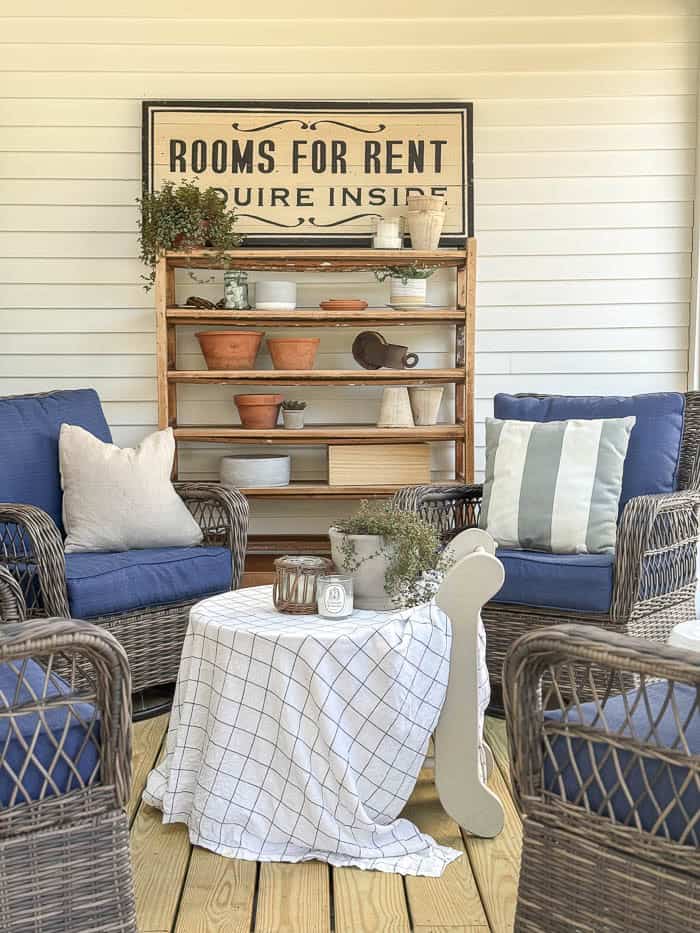 I shopped my home for all the other smaller furniture pieces. Side tables, garden stool, accessories – these were all items I already had. I had been looking for weeks for a small round coffee table, but not seeing anything I loved, I remembered I had inherited this little wooden antique table from a family friend’s beach house they were remodeling a couple of summers ago. I brought it up from the basement, and to my surprise, it fit perfectly on our porch. I gave it a quick coat of paint, and then draped a table cloth over it just to soften the overall look on the porch.