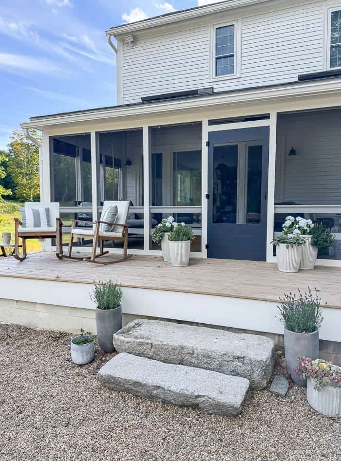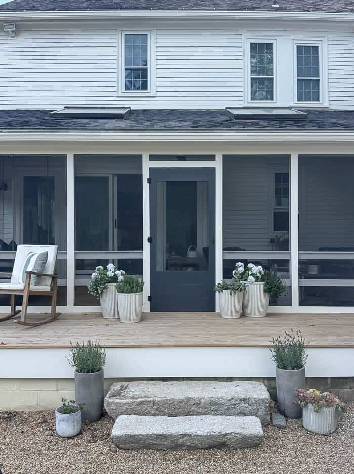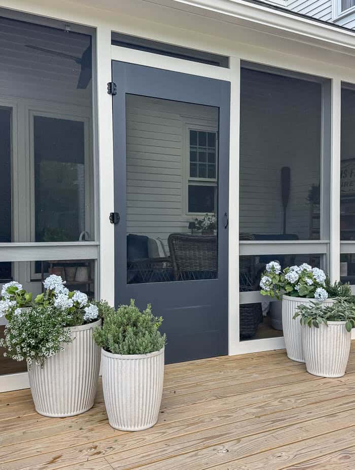 Because we were working with the original framing structure of the screened-in porch, finding a new screen door was proving to be quite difficult, and custom screen doors can be quite costly. My husband decided to build us our own custom screen door, and I painted it Wrought Iron by Benjamin Moore to match our existing exterior doors.