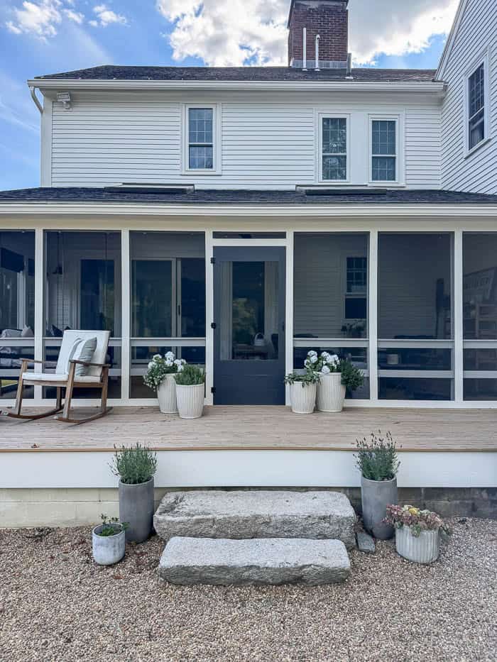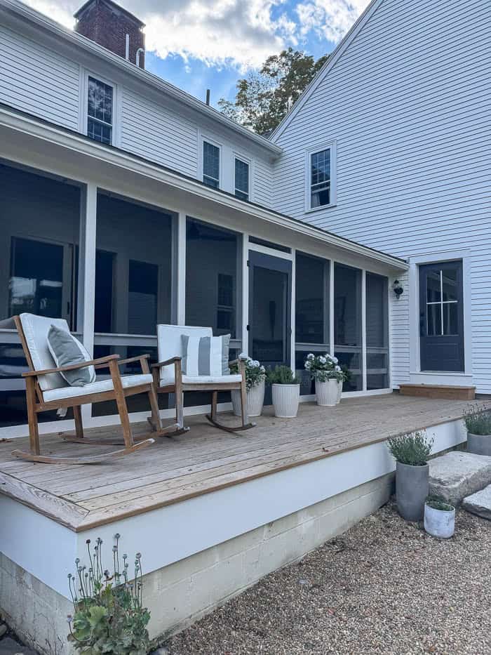 I am so excited to share with you our Back Deck Reveal! I will be the first to tell you that I completely underestimated the impact that this renovation was going to have on the exterior of our home. Maybe that’s because after living with the previous condition of our back deck for three years, your eyes become used to it, and the sore spots that once stuck out no longer do. Our back deck makeover has completely transformed our home’s curb appeal with a blend of classic design elements and modern comfort. Step inside (or rather, step outside) as we reveal the finished porch and all the details that brought it to life.