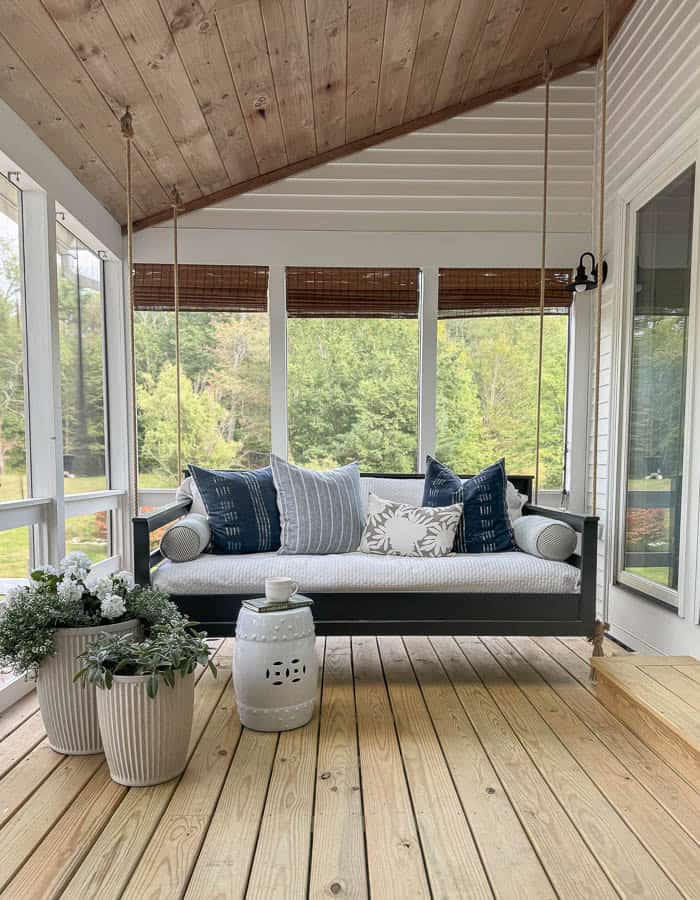 On the opposite side, a DIY daybed swing we built hangs, providing the perfect spot for an afternoon nap.
