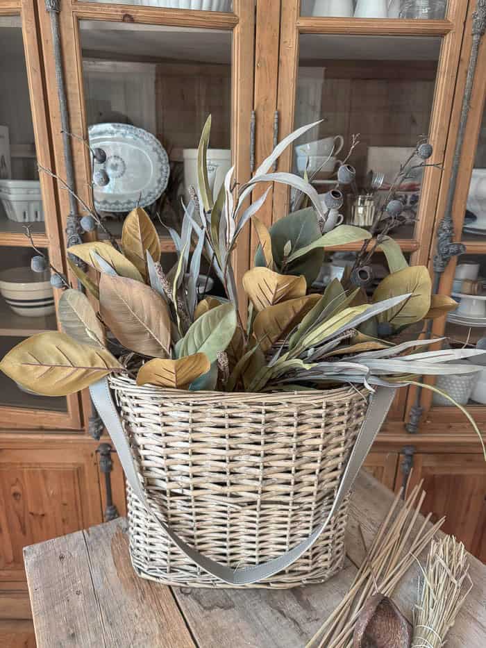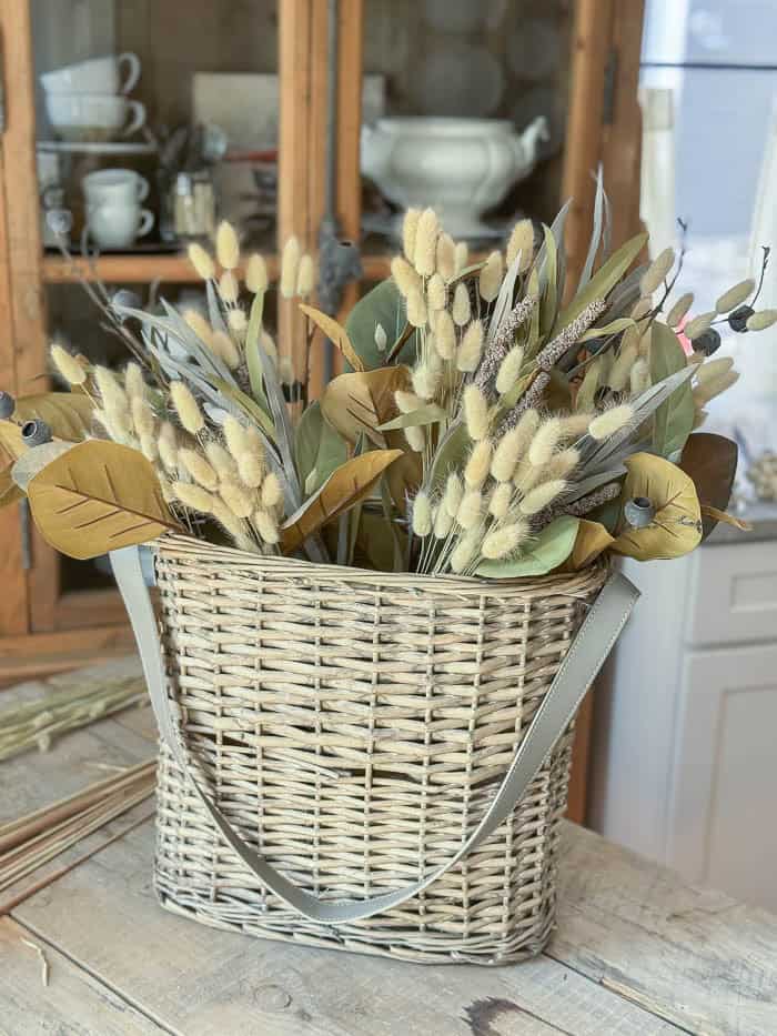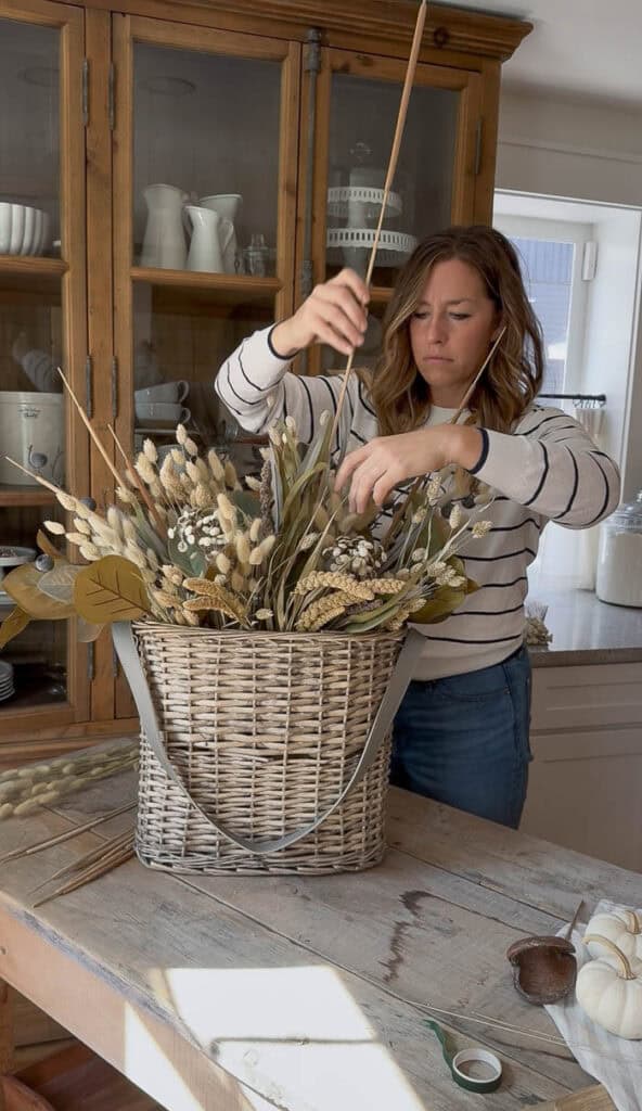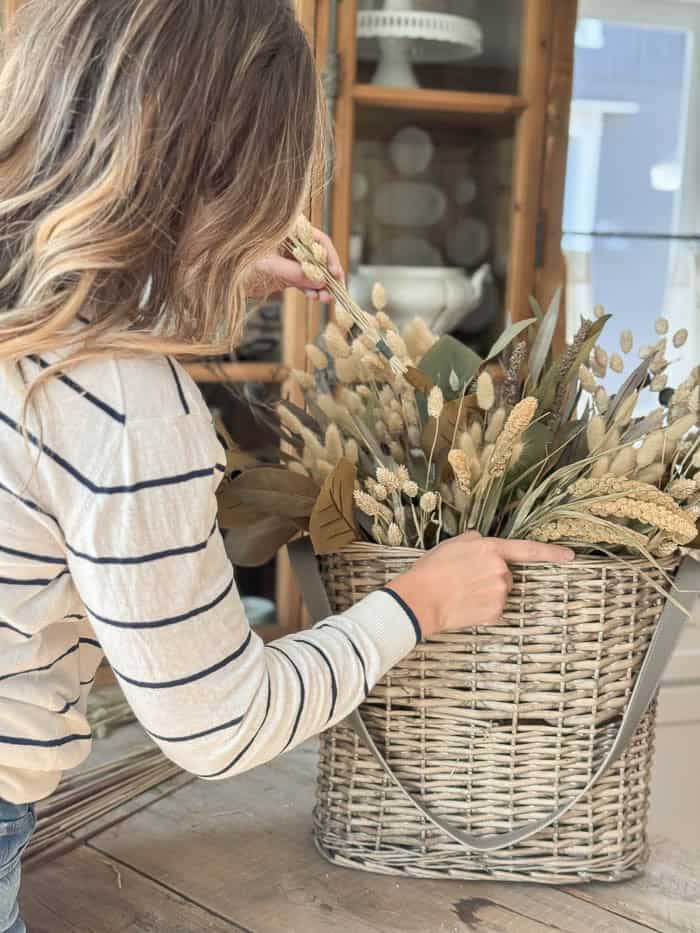 Then I began by placing my faux fall stems first. These larger stems helped fill in my basket and provided pockets for me to add in my smaller stems, like bunny tails and dried wheat around them.