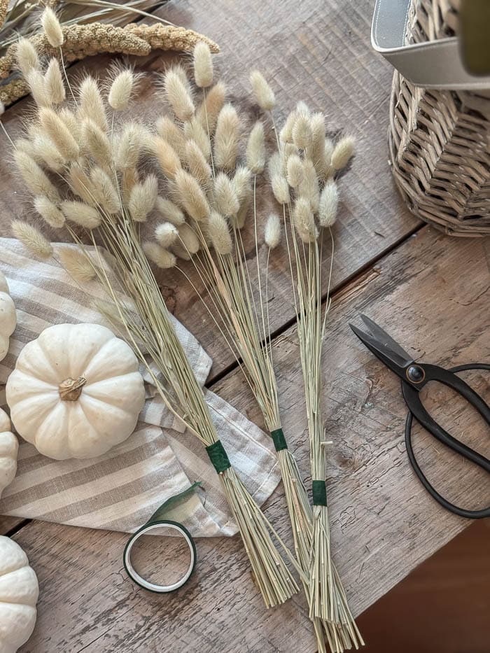 With my faux stems in place, it was time to add in the clusters of preserved stems. I used dried bunny tail, wheat, and white button flowers to add layers and fullness to my arrangement.