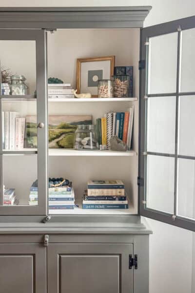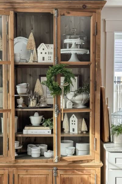 Hi Friends! If you’ve been here awhile, you might remember that this corner of our kitchen used to be an unused desk area. Last year we transformed it to make room for the antique pine cupboard I scored on FB Marketplace—one of my favorite finds to date. I never got to decorate it for Christmas, so this season I couldn’t wait to add a few of my favorite festive pieces. Today I’m sharing how I decorated our vintage cupboard for Christmas, along with easy tips you can use to style your own hutch, cabinet, or open shelving for the holidays. ... Read More about Simple & Cozy Christmas Decorating Ideas from my Kitchen Cupboard