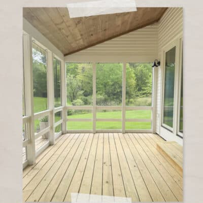 Last year, we began giving our back deck a makeover. I shared the Design Plans with you HERE, and Part 1 of the Renovation process HERE. At the end of Part 1, I shared how we would be installing new screens this coming spring, and I’m so excited to tell you that our porch is done! Before I share the full reveal, I wanted to show you the progress of installing the new screens and the details on how we built our new porch railings. I contemplated many different styles for our porch railings, and I am so pleased with how they turned out.