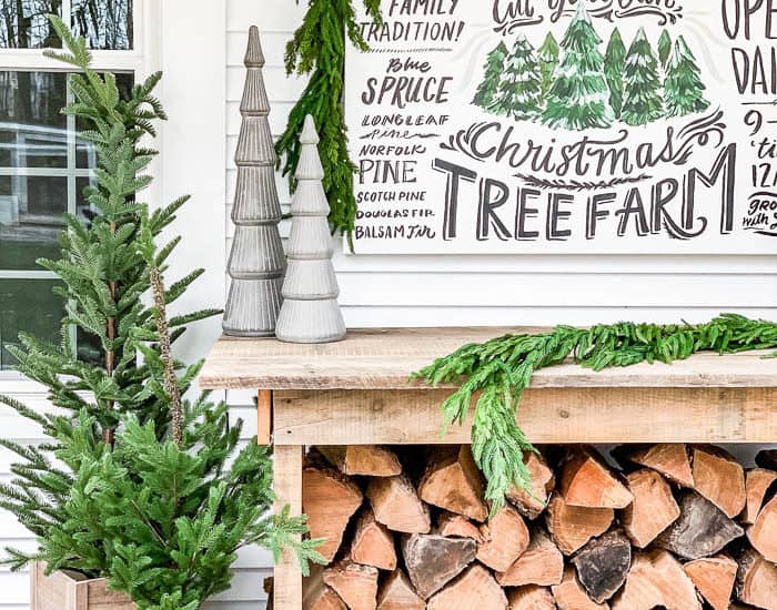 After having what seemed like the most mild fall in history, our temps here in New England are telling us winter is on it’s way! In fact we’ve already had some snow fall, but with temps in the 70’s a few days later, it melted pretty quickly. With porch sitting weather no longer in season, I start to get our outdoor spaces prepped and ready for winter. Patio furniture gets put away, and any remaining signs of fall – i.e. our pumpkins, get fed to the chickens. Since we do get some snow on our farmers porch in the winter, I like to keep the furniture on it minimal. Making it easy to clear and walk on for shelter from the winter elements. I cleared off our porch the other day to start the process of outdoor prep, and created this sweet little Christmas Tree Farm vignette, perfect for the upcoming holidays, but something that can last all winter long.