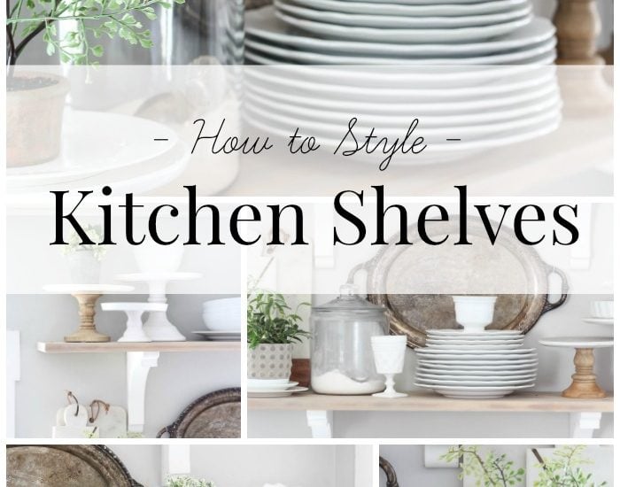 Hello friends! Recently I shared in my FB group, “Coffee with Bre”, how I go about styling our open shelves in the kitchen. I shared LIVE in the group from start to finish and explained my thought process along the way for how I tackle each individual shelf, and the overall look of all three open shelves together. I thought it would be fun to share the process on here too, and break things down step by step for how I style the open shelves in our kitchen.