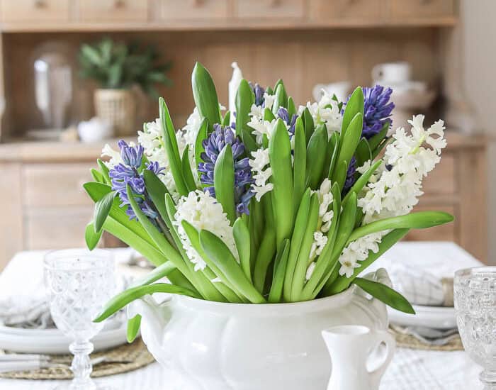 It finally feels like spring is on it’s way here in New England, and I couldn’t be more excited! While we are still waiting to see spring bulbs pop up from the ground, our grocery stores have been filled with a variety potted spring bulbs. I think it’s no secret around here that I love setting a beautiful table, so with all the spring inspiration around me, I wanted to share 3 different spring centerpiece ideas with you to celebrate the arrival of Spring. Each centerpiece is completely different, but I think you will find all 3 ideas have one thing in common – spring bulbs! I’d love to know which one is your favorite? So come and table a look, and be sure to let me know in the comments at the end of the post.